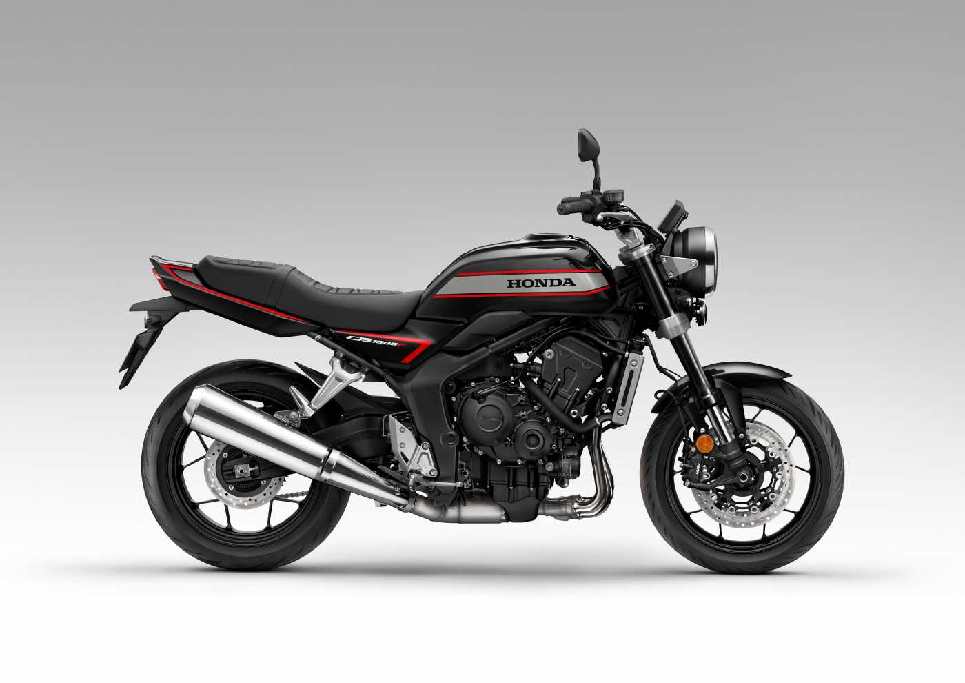 Mit der Einführung der CB1000F führt Honda seine legendäre CB-Baureihe fort. Das neue Nakedbike mit cooler Retro-Ausstrahlung ist eine Hommage an die einstige Bol d'Or-Modellreihe, die in Europa große Verkaufserfolge erzielte und auch in der US-Superbike-Szene unter Freddie Spencer spektakuläre Erfolge feierte. Der gezielt überarbeitete DOHC-Reihenvierzylinder basiert auf dem 2017er Fireblade-Triebwerk, das auch in der gefeierten CB1000 Hornet zum Einsatz kommt. Die Leistungsabgabe wurde gezielt in den unteren und mittleren Drehzahlbereich verlagert und verbindet geschmeidige Laufruhe mit ausgeprägt starkem Durchzug und leichter Fahrbarkeit. Das Elektronikpaket mitsamt Sechsachsen-Gyrosensorik, HSTC-Traktionskontrolle und Hinterrad-Abhebeberkennung steuert drei Fahrmodi (Sport, Standard, Rain) sowie zwei User-Modi. Die Federung übernehmen eine voll einstellbare Showa 41 mm SFF-BP Upside-Down-Telegabel und eine asymmetrische Aluminiumschwinge mitsamt Pro-Link-Monofederbein. Die Verzögerung erledigen radial montierte Vierkolben-Bremssättel, die auf schwimmend gelagerte 310-mm-Scheiben zugreifen, dazu steigert Kurven-ABS die Sicherheit maximal. Ein 5-Zoll-TFT-Bildschirm bietet RoadSync-Smartphone-Konnektivität, die Zündung wird bedienungsfreundlich per Smartkey aktiviert. Drei Farbvarianten stehen zur Auswahl: